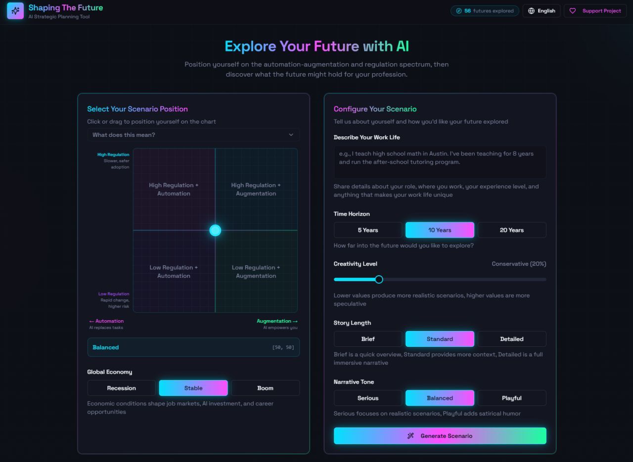 An interactive AI strategy tool that generates realistic day-in-the-life scenarios for roles under different automation, regulation, and economic futures. It also breaks down typical duties into individual tasks for the given role and see which of those tasks have potential to be automated and which ones will still need a human touch. Perfect for workshops, strategy sessions, and understanding responsible AI impacts.